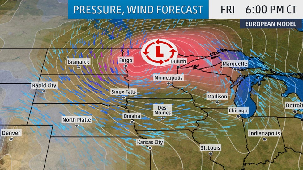 By Friday, strong low pressure will wrap up near the Canadian border in northern Minnesota, with wind-driven snow in the Dakotas and parts of Minnesota.