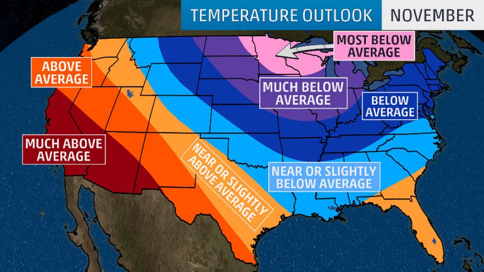 "Given the higher confidence in a notably cold pattern in at least the first half of November, we’ve cranked up the magnitude of our negative anomalies, but have maintained the same general shape of the pattern," said Dr. Todd Crawford, chief meteorologist at The Weather Company.
