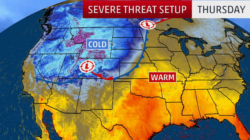 Severe thunderstorms will threaten the southern Plains and Midwest Thursday on the warm side of a major October snowstorm in the northern Plains and Rockies.