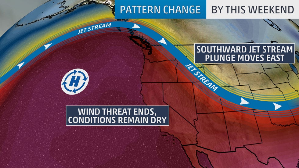 By Friday, the jet stream will build northward along the West Coast as its corresponding southward plunge moves toward the central and eastern states. That will put an end to the threat of strong winds in California into early next week.