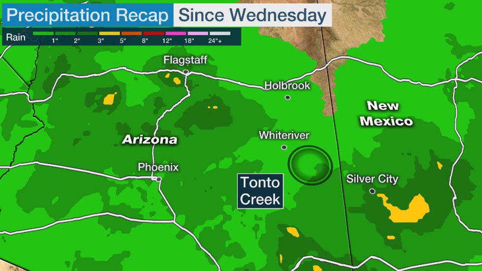 Emergency personnel and law enforcement helicopters rescued two adults and two children on Friday, who also were in the vehicle swept away in Tonto Creek. They were rescued from a small island and the bank of the creek in Tonto National Forest northeast of Phoenix.