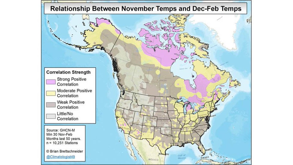 The rest of the country – including most of the Great Plains and Rockies – doesn't have much of a correlation between temperatures in November and those during the heart of winter.