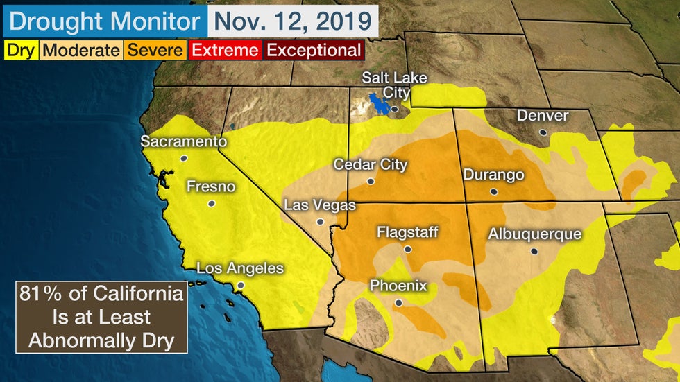 More than 80% of California is at least abnormally dry, according to the latest U.S. Drought Monitor, since precipitation has not fallen this wet season. This is a big jump from Nov. 5, when less than 18% of the Golden State experienced abnormally dry conditions.