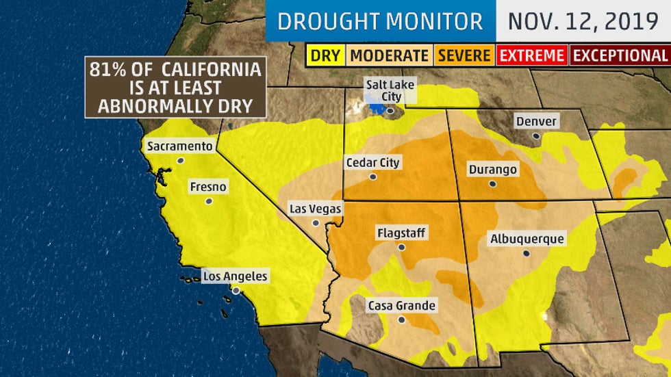More than 80% of California is at least abnormally dry, according to the latest U.S. Drought Monitor, since precipitation has not fallen this wet season. This is a big jump from Nov. 5, when less than 18% of the Golden State experienced abnormally dry conditions.