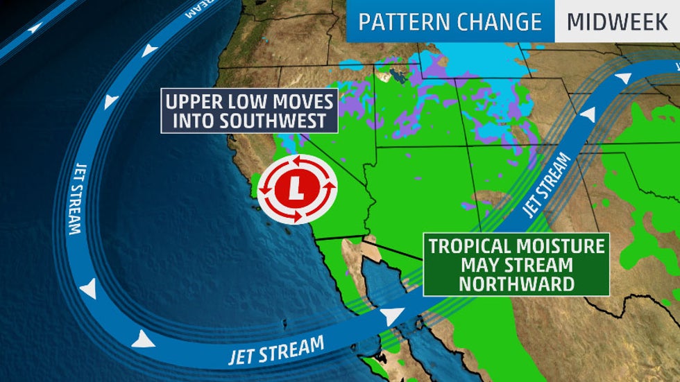 The cutoff low will combine with a low-pressure system that'll move into the Southwest midweek. This system will first push into the Northwest early in the week before diving southward.