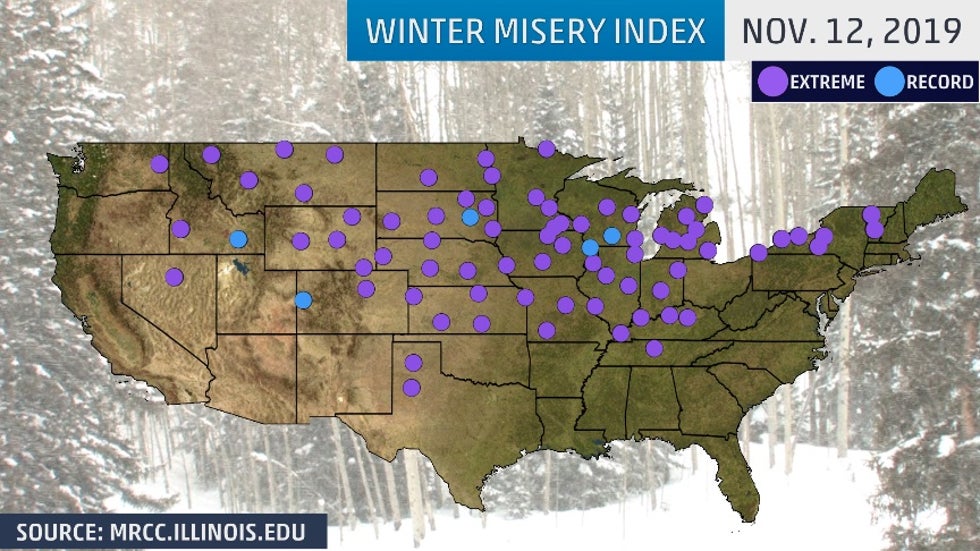 According to the Accumulated Winter Season Severity Index (AWSSI) from the Midwest Regional Climate Center, over 70 cities from the Great Basin and Rockies to the Plains, Midwest and eastern Great Lakes have seen an extreme season-to-date of cold and snow as of Nov. 12.