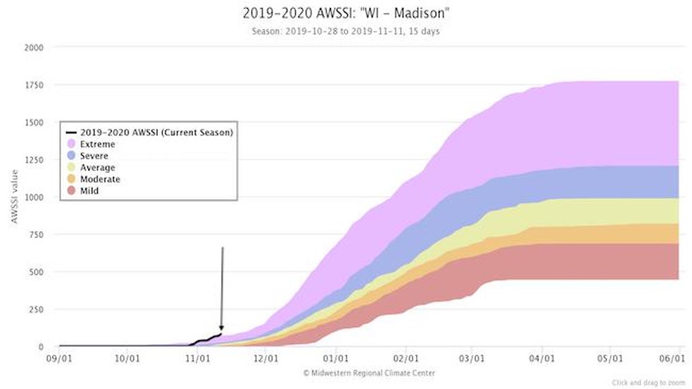 -Madison, Wisconsin: Like Dubuque, the Badger State capital city has its snowiest start to any winter season through Veterans Day on record (15.4 inches). At least a trace of snow was reported in Madison 10 of 15 days from Oct. 28 through Nov. 11. If it wasn't for a balmy Sunday before Halloween, Madtown would have a 19-day streak of colder than average temperatures from Oct. 24 through Veterans Day.