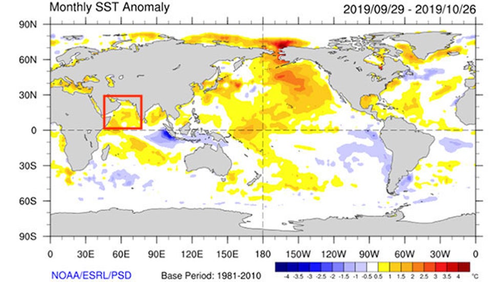 First, ocean temperatures over the Arabian Sea were warmer than average, generally from 0.5 to 1.5 degrees Celsius, according to a NOAA analysis.