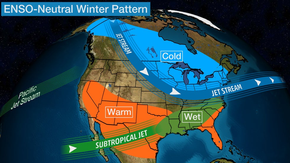 The subtropical jet stream may also shift the track of storms, resulting in a wet winter in parts of the South. The Pacific storm track may also bring low pressure systems that move more into the Northwest versus California compared to a typical El Niño winter.