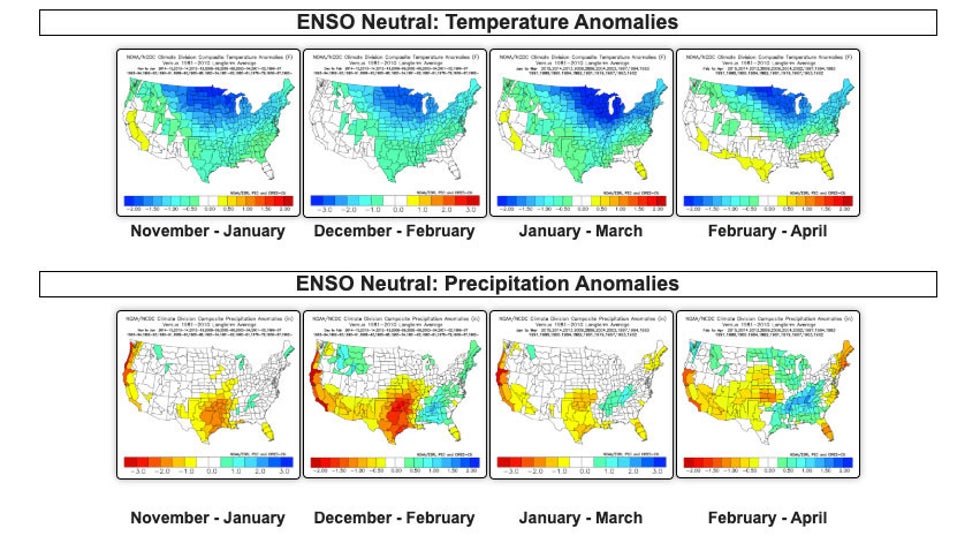 The maps below show the temperature and precipitation departures from average for three month periods during neutral winters since the early 1960s. The 30-year average is based on 1981-2010 data.