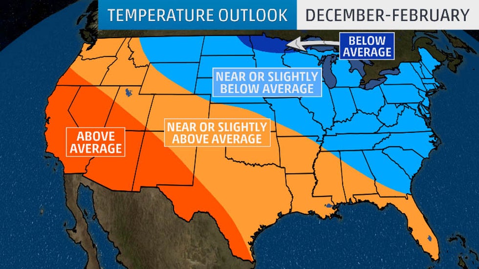 A broad area from the Pacific Northwest to the central Rockies, Southern Plains, lower Mississippi Valley and Gulf Coast will likely have temperatures that are near or slightly warmer than average this winter. Meanwhile, the northern Rockies, Northern Plains, Midwest and East can expect near or slightly below average temperatures for the December-to-February period as a whole.
