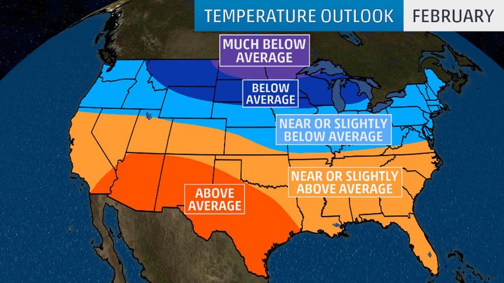 Near or slightly above average temperatures are predicted from the Northwest into the central Rockies, Southern Plains, Gulf Coast and Florida.