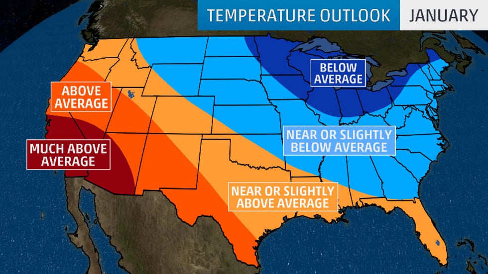 Regarding its temperature outlook, NOAA expects areas from the Northeast through the South and into the West to have a higher chance of above average temperatures from December to February.