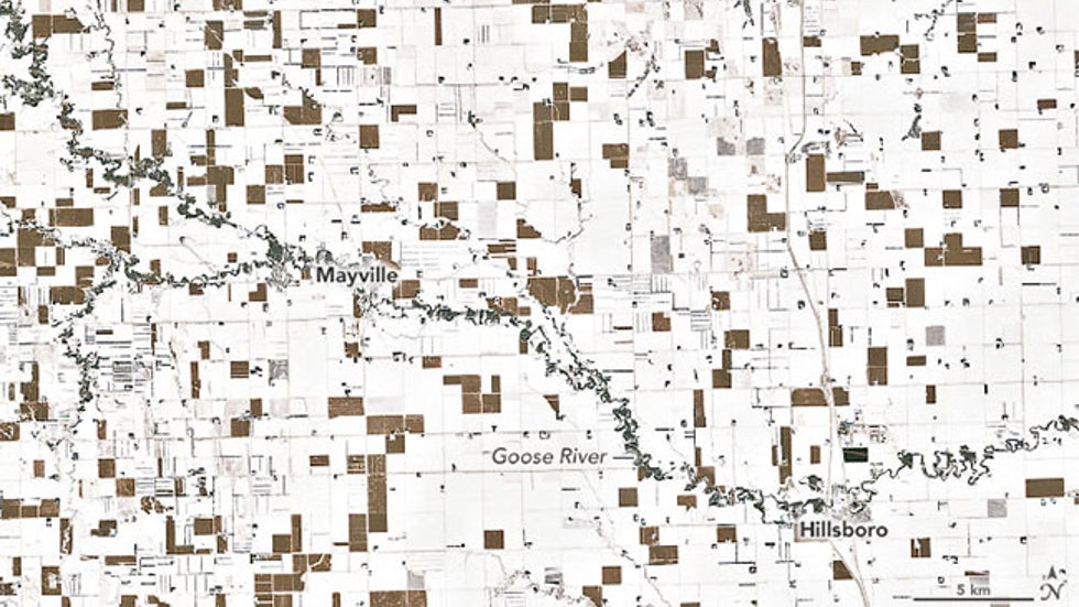 According to Daryl Ritchison, director of the North Dakota Agricultural Weather Network, those brown parcels were unharvested corn. Ritchison, who tweeted a zoomed-out version of this satellite image, told NASA's Earth Observatory it doesn't mean there isn't snow on the ground in those fields, but instead the corn stalks are growing close enough to essentially shield the satellite from seeing snow cover in those unharvested fields.