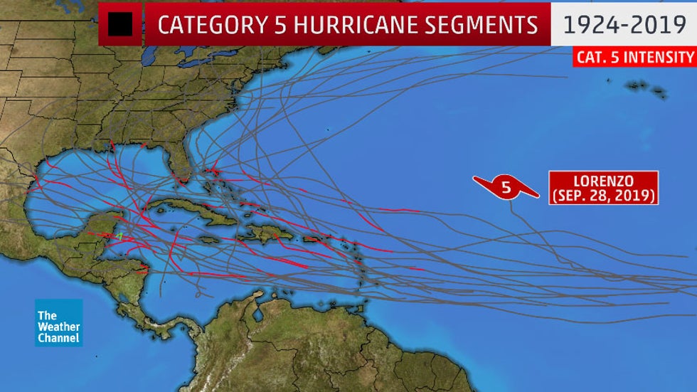 Hurricane Lorenzo became a Category 5 hurricane farther east than any other Atlantic hurricane in records dating to the 1920s. The plot of Lorenzo's position at Cat. 5 intensity relative to other Cat. 5 tracks is the textbook definition of an outlier.