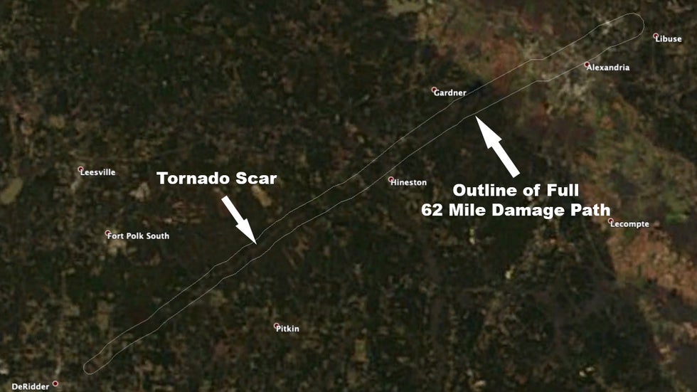 Below is another view of the scar with an overlay of the tornado's full damage path from the National Weather Service survey. A portion of the forest scar is in southeast parts of Fort Polk Army Base.