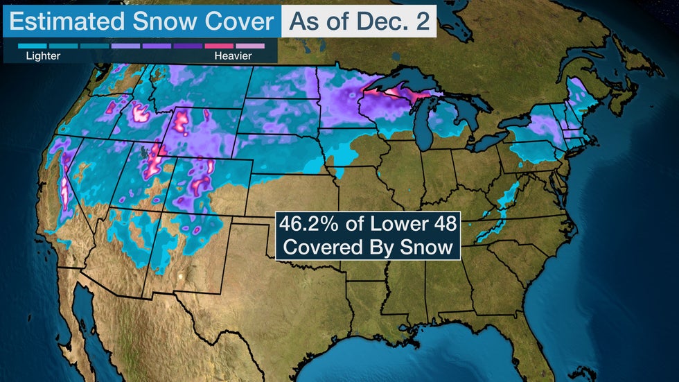 An estimated 46.2% of the contiguous U.S. had snow on ground as of Monday morning, according to NOAA's National Operational Hydrologic Remote Sensing Center. That's well above the 25.9% average Dec. 2 snow cover for the last 16 years.