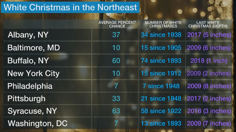 Below we break down various white Christmas statistics, including the yearly probability, the number of white Christmases in each city's historical record and the last white Christmas. All statistics and data are courtesy of the National Weather Service.