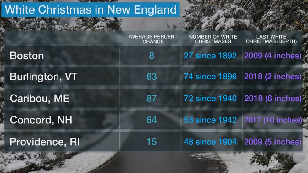 Burlington, Vermont, and Caribou, Maine, have seen more than 30 inches of snow on the ground in Christmases past. In 2018, both cities saw a white Christmas again, with 2 inches on the ground in Burlington and a half foot in Caribou.