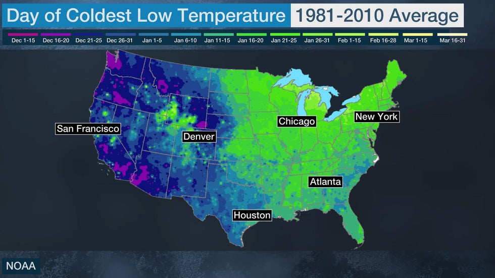January, on average, is when the coldest day of year occurs in much of the eastern half of the nation and higher elevations of the Rockies. You can see this in the green and lighter blue shadings on the map above, which show the date of the coldest average low temperature (1981-2010 average).