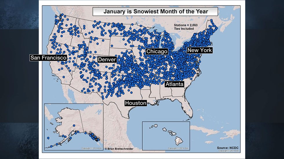 January was the snowiest month for nearly 50% of those stations. This includes locations plotted in blue below from the Northeast to the Midwest, mid-South and parts of the West.