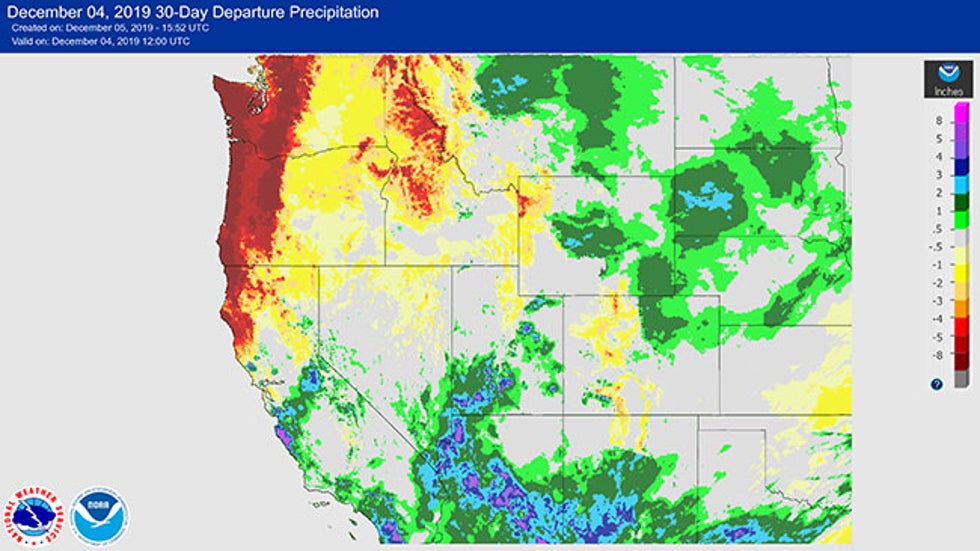 According to the USDA's National Water and Climate Center, snowpack in the Washington and Oregon Cascades, as estimated by the water content in the snow, was only 8 to 39% of average for early December.