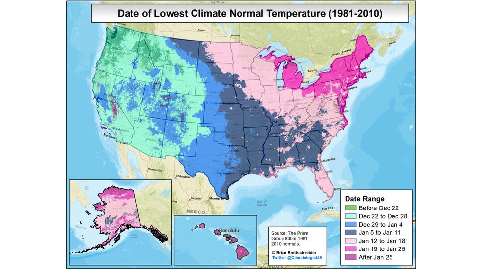 Dr. Brian Brettschneider, a climatologist at the University of Alaska Fairbanks, compiled the map below, which illustrates the date when average temperatures – based on the 30-year period from 1981 to 2010 – plunge to their lowest values of the year.