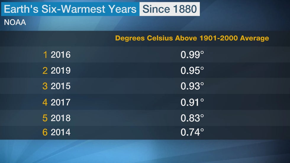 The six warmest years in NOAA's 139-year database have all occurred since 2014. The warmest year globally was in 2016.
