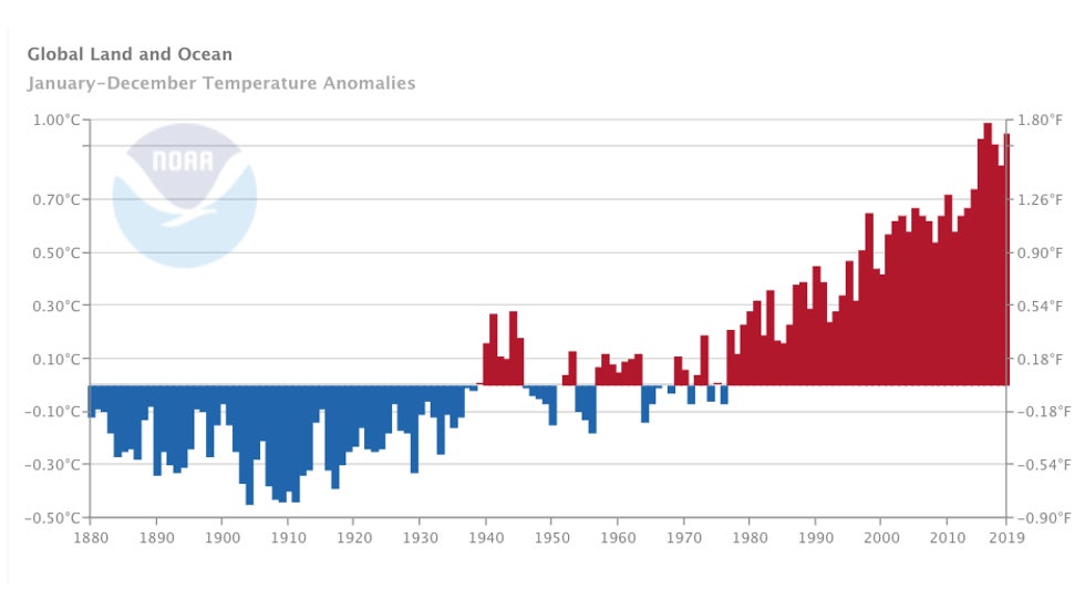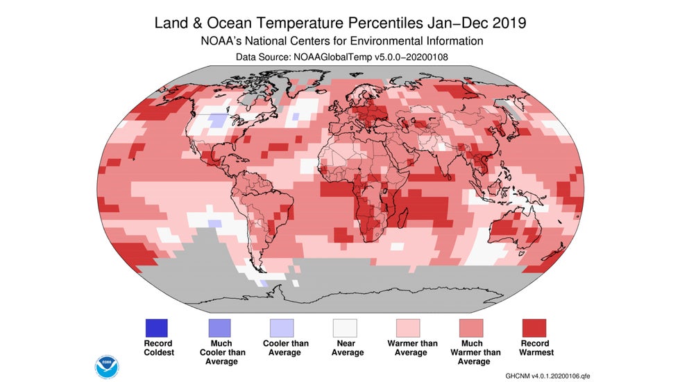 Earth had its second-warmest year on record in 2019, marking an unprecedented run of six consecutive years where global temperatures were the highest on record, according to a NOAA report released Wednesday.