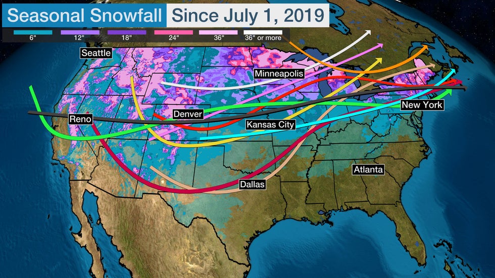 The map below shows how much snow has fallen in the Lower 48 states so far this winter. The areas in the purple and pink contours have picked up the most snowfall through Jan. 20. This includes parts of the Mountain West, Rockies, Northern Plains, upper Midwest, northern Great Lakes, upstate New York and northern New England.