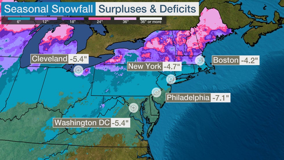 A measly 0.3 inches of snow has been tallied in Philadelphia this winter, about 7 inches below average by this point in the season. Only 0.6 inches have been measured in Washington, D.C., a deficit of more than 5 inches.