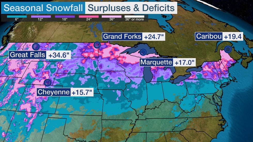 Caribou, Maine; Cheyenne, Wyoming; and Marquette, Michigan, have all measured over a foot of snow above their seasonal averages.