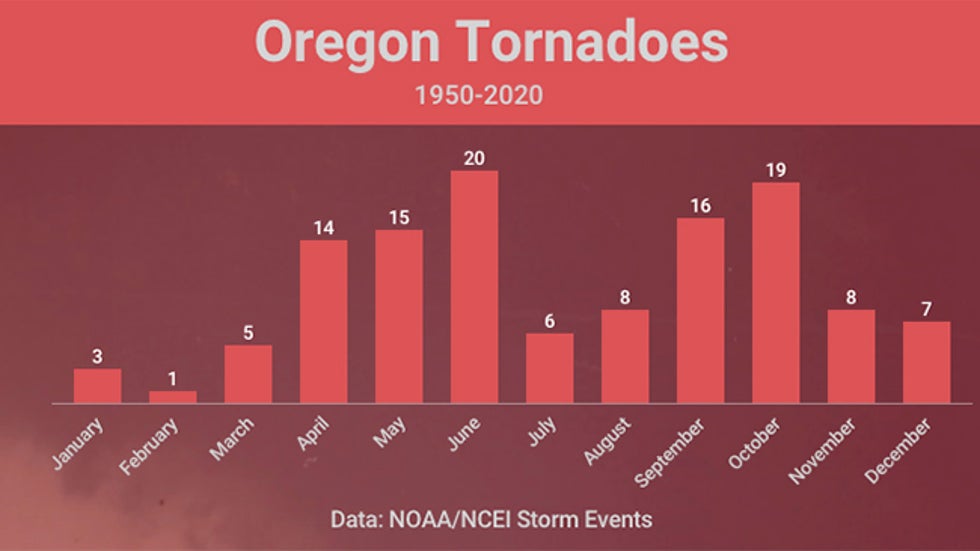 Since 1950, only 11 Oregon tornadoes, including Tuesday's tornado, have occurred in the winter months of December, January or February, according to NOAA's Storm Events database.