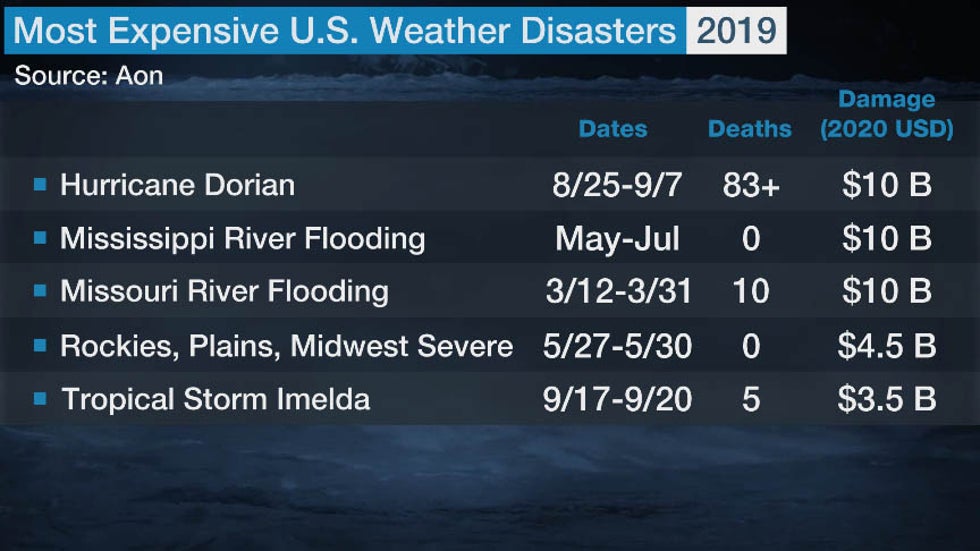 The table below lists the five costliest weather disasters, according to Aon's database, that had impacts in the U.S. last year. Three disasters each produced $10 billion in damage: Hurricane Dorian (mostly in the Bahamas, however), Mississippi River flooding and Missouri River flooding.