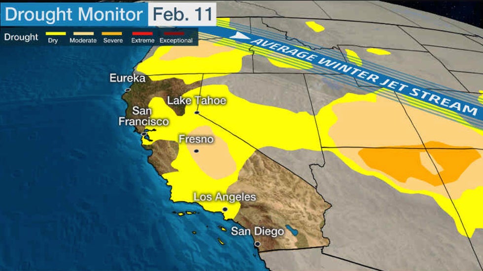 A persistent storm track has kept winter storms to the north and east of California since December. The average jet stream track since the beginning of December, as seen in the above graphic, has kept temperatures warm and precipitation far below average.