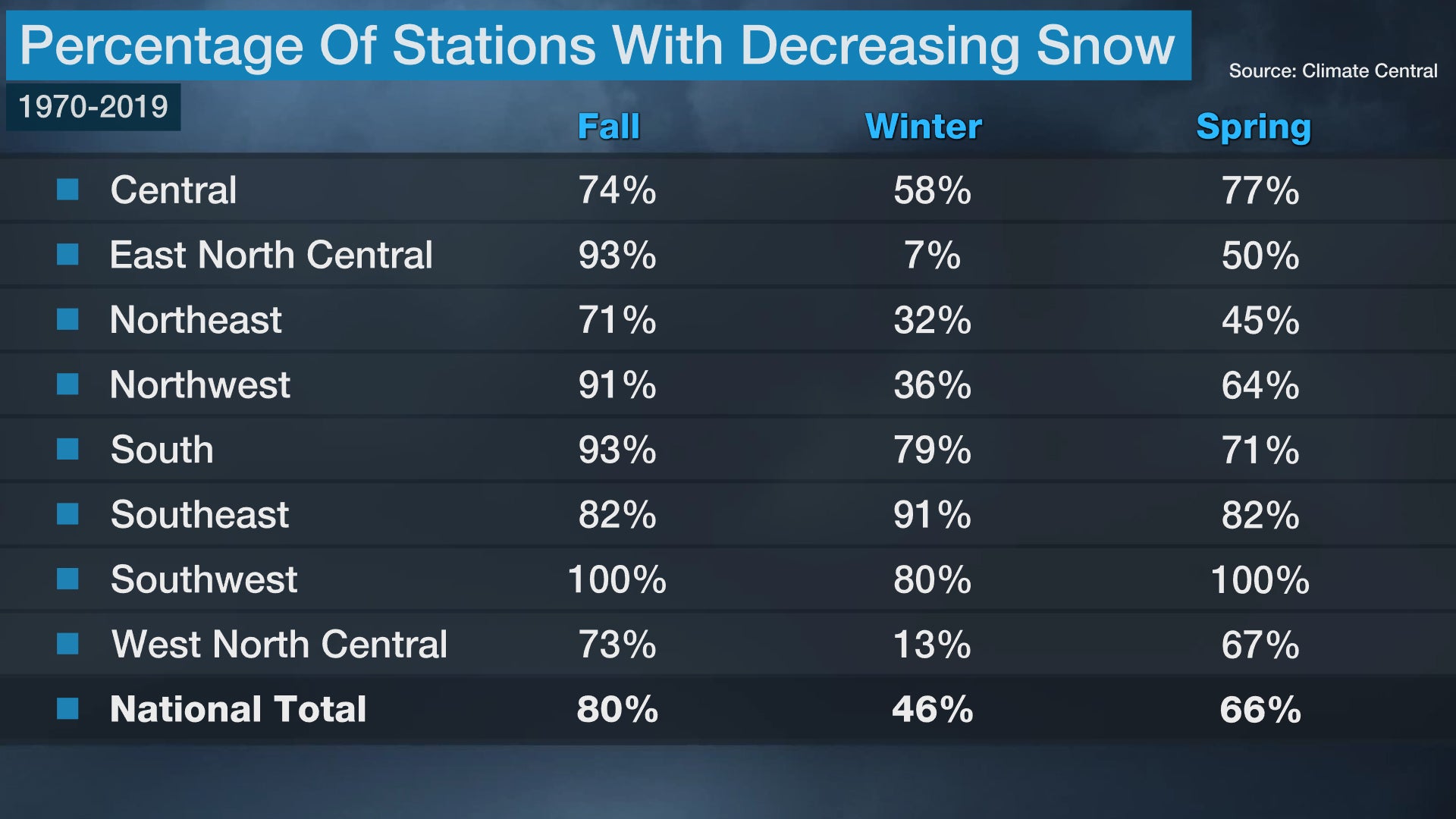 It makes sense that snowfall is becoming more scarce during warmer times of the year (fall and spring) and along the southern fringes of where snow traditionally falls in most years.