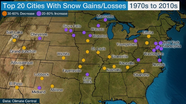 The top 20 cities with the greatest percentage loss (orange dots) and gain (purple dots) of snow from the 1970s to the 2010s.