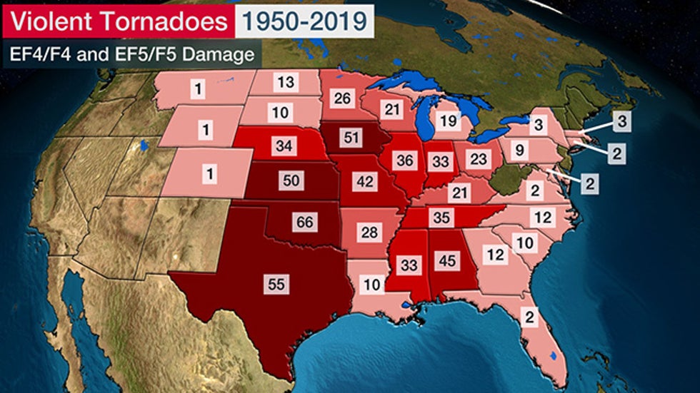 In the 70-year period from 1950 to 2019, the conventional Plains "Tornado Alley" states of Oklahoma, Texas, Iowa and Kansas had the biggest number of violent tornadoes.