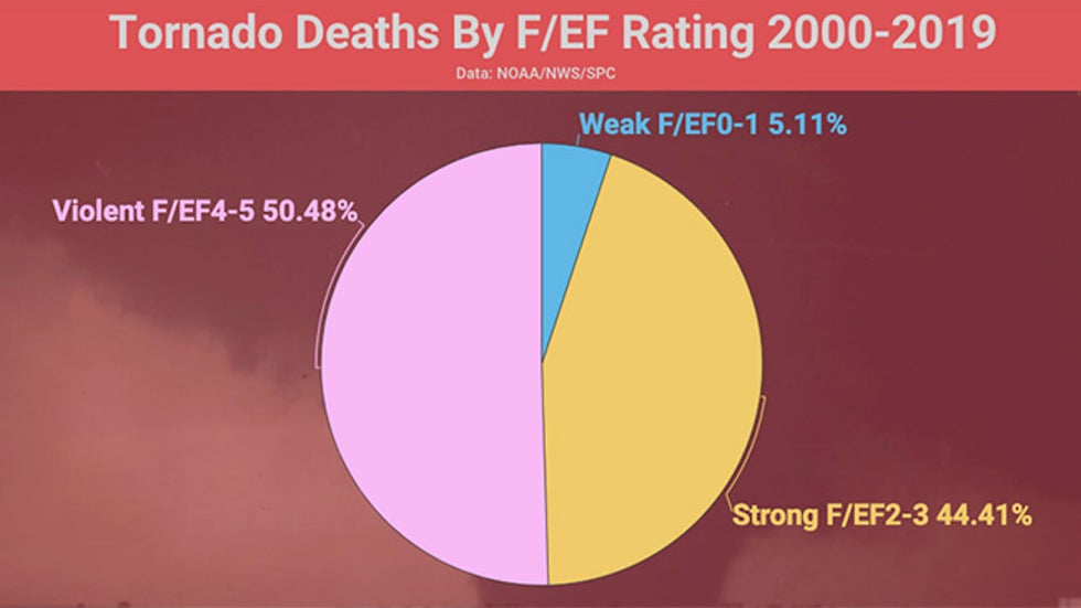 From 2000 to 2019, violent tornadoes were responsible for roughly half of all U.S. tornado deaths, according to data from NOAA's Storm Prediction Center.