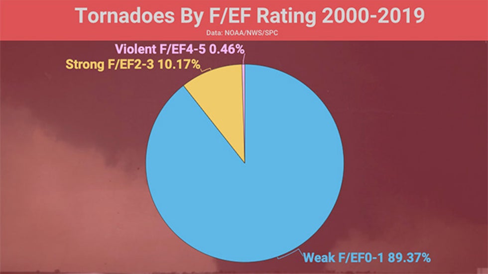 Almost 90% of tornadoes from 2000 to 2019 were weak – rated F/EF0 or F/EF1 – but they're still capable of light to moderate damage to trees and homes, and significant damage to mobile homes.