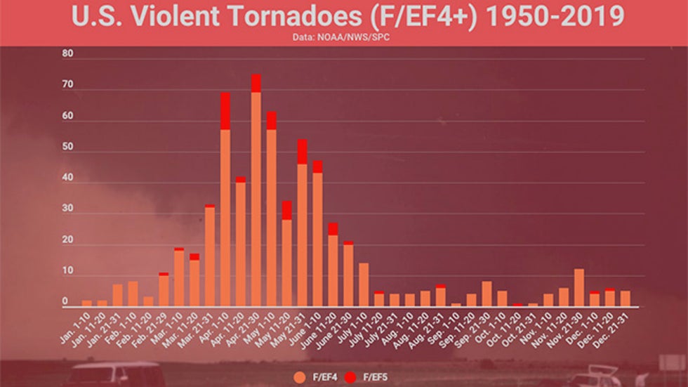 We examined the 631 violent tornadoes in NOAA's database from 1950 through 2019 to see if there was a peak time of year.