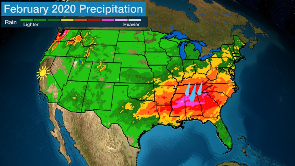 February showed an incredible contrast in precipitation across the United States, from the waterlogged Southeast to suddenly bone-dry California.