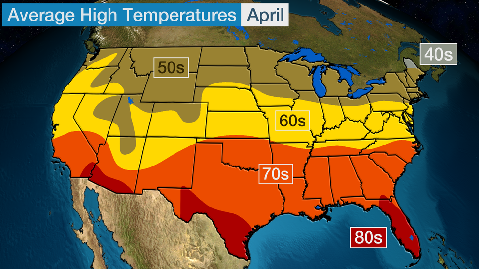 Average high temperatures in April range from the 50s across the northern tier to the 70s in much of the South. Northern Maine typically holds in the 40s, while parts of Florida, southern Texas and the Southwest commonly reach the 80s.