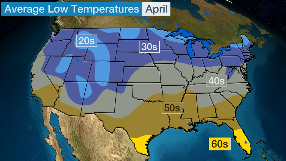 Nights can still be chilly in April, as lows often dip into the 20s and 30s in the North and the Rockies. Low temperatures in the 40s are average for April from the mid-Atlantic to the central Plains and parts of California. Lows in the 50s are common in the South, with 60s typical in parts of Florida and South Texas.