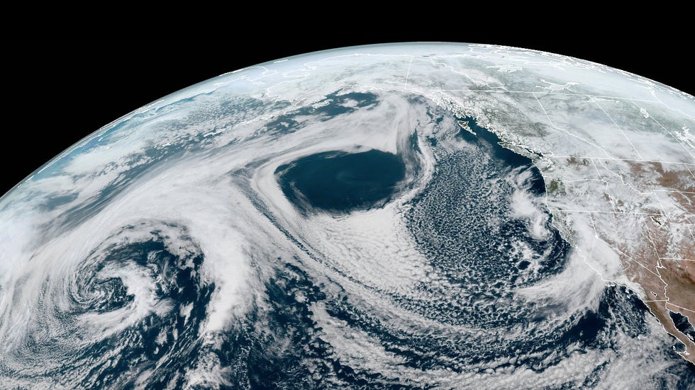 Satellite imagery captured a strange sight over the North Pacific Ocean on Sunday: amid plenty of cloud cover, a big hole of clear skies appeared.