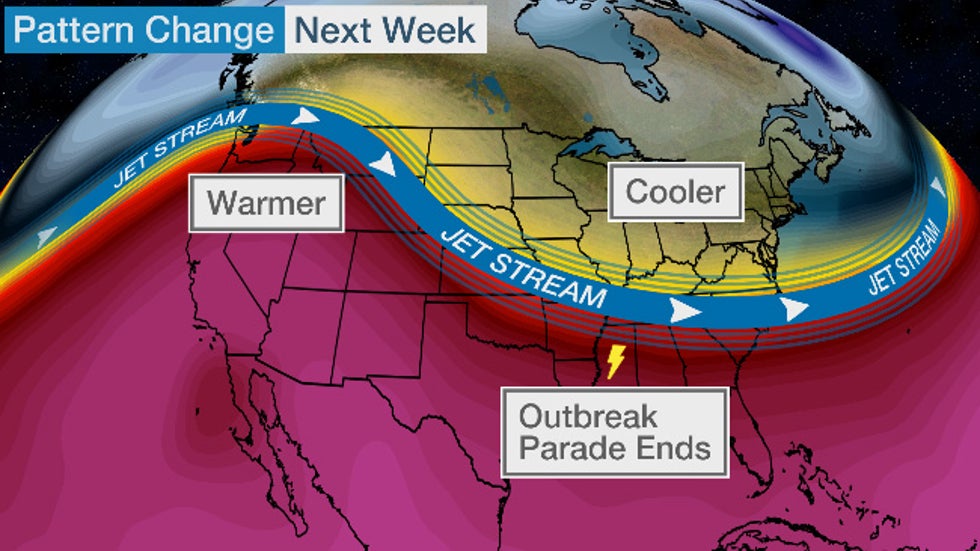 A change in the weather pattern will take shape across the United States by next week, heating up the West, keeping the East cool and putting an end to the recent parade of severe weather outbreaks in the South.