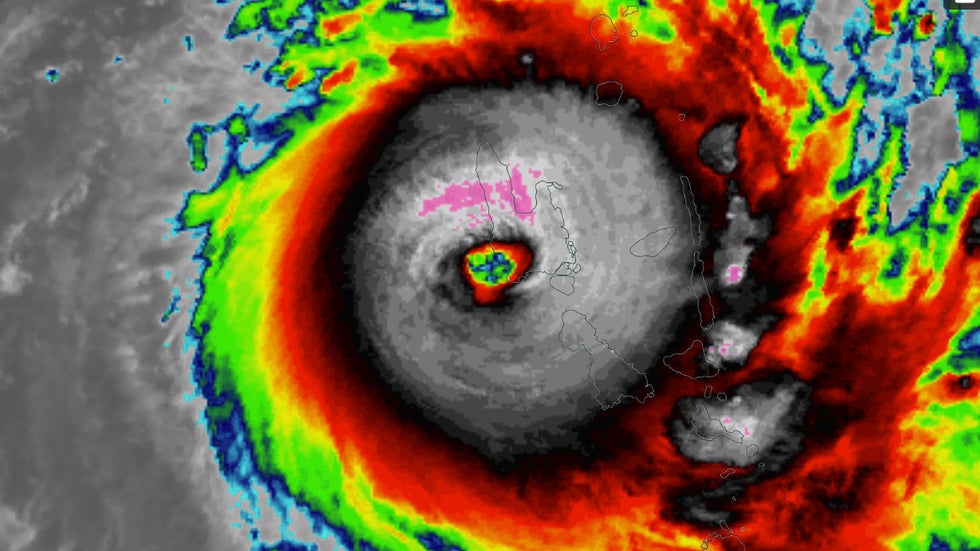 Below is a closer view of Harold's eye when it was making landfall on Espiritu Santo. Maximum sustained winds at the time were estimated to be 145 mph, or equivalent in strength to a strong Category 4 hurricane, according to the Joint Typhoon Warning Center (JTWC).