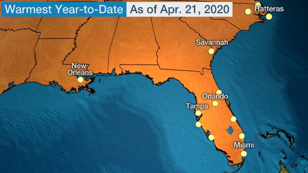 Daytona Beach, Orlando, Tampa, Sarasota and Vero Beach have also been sweating through a record warm start to the year.