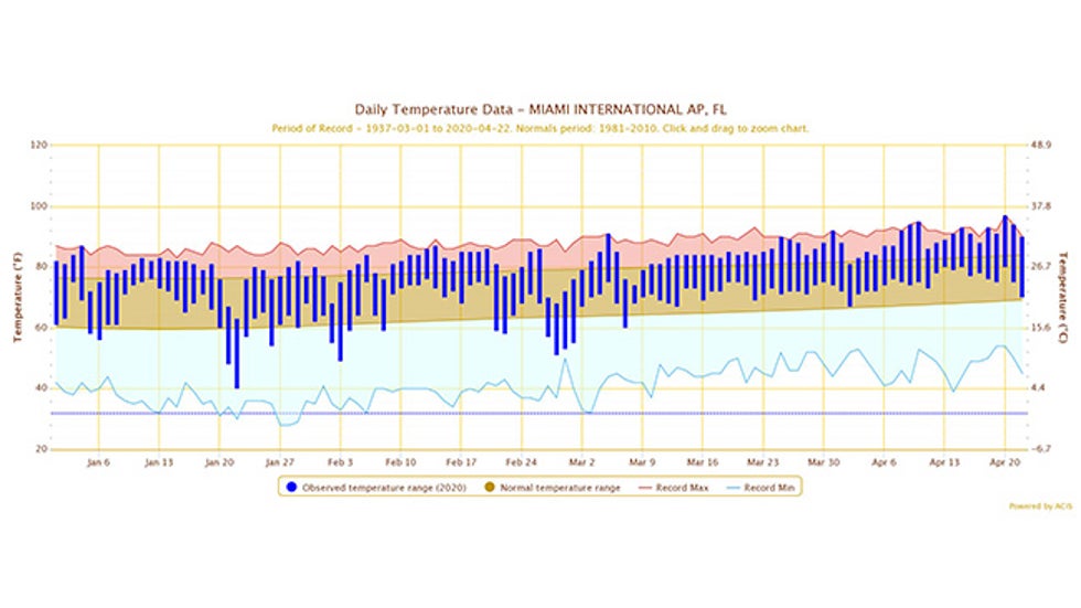 Through April 22, Miami had already logged 14 days with a high in the 90s in 2020, doubling their previous record year-to-date 90s tally, according to Eric Blake, a National Hurricane Center scientist and South Florida resident.