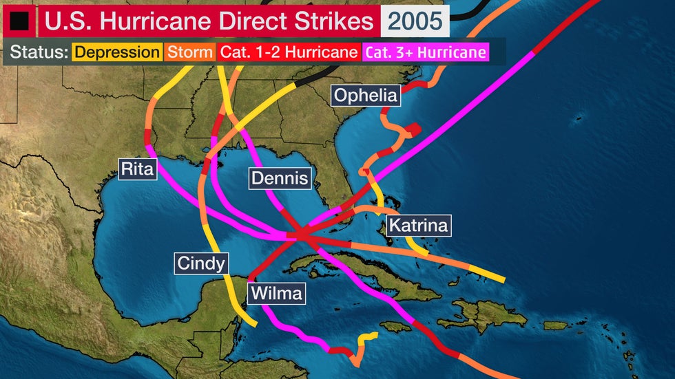 Six hurricanes made a direct strike on the U.S in 2005: Cindy, Dennis, Katrina, Ophelia, Rita and Wilma. All of those hurricanes made a U.S. landfall except Ophelia, which was classified as a direct strike since its circulation center stayed just offshore of eastern North Carolina, but still brought sustained winds up to hurricane force.
